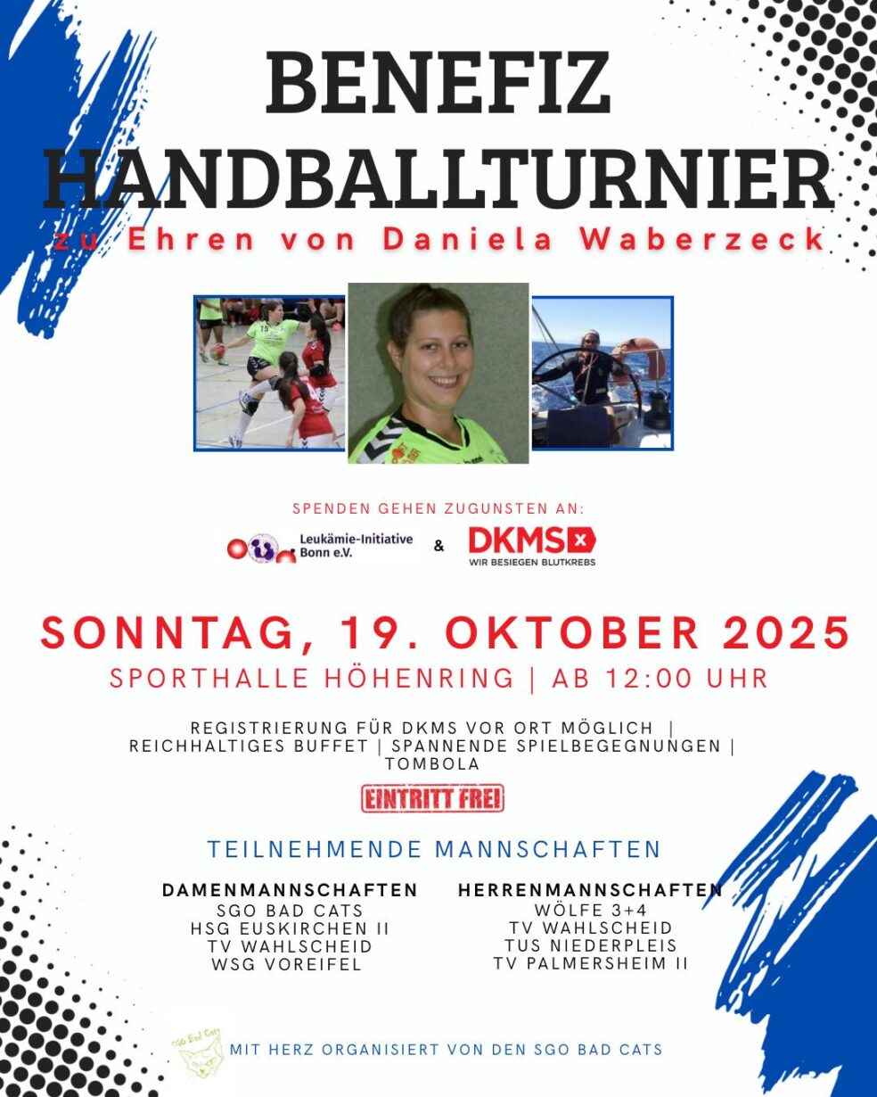 Am Sonntag, dem 19.Oktober 2025, laden wir Euch herzlich in die Sporthalle am Höhenring 101 in Heimerzheim ein. Gemeinsam möchten wir ab 12:00 Uhr mit einem Benefiz-Handballturnier unserer Dani gedenken, die uns als Freundin, Mitspielerin und Mensch so viel bedeutet hat.Es erwarten euch spannende Spiele unserer Damen- und Herrenmannschaften, eine Tombola, ein reichhaltiges Buffet und die Möglichkeit, euch direkt vor …